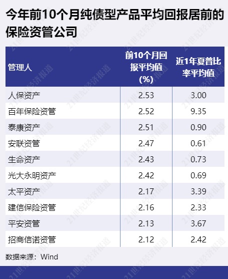 保险资管公司的纯债型产品前10个月平均回报排名也出现变化,人保资产以微弱差距夺走第一,平均回报为2.53%,百年保险资管以2.52%排第二。泰康资产、光大永明资产等排名也有所上升,泰康资产以2.51%排第三。