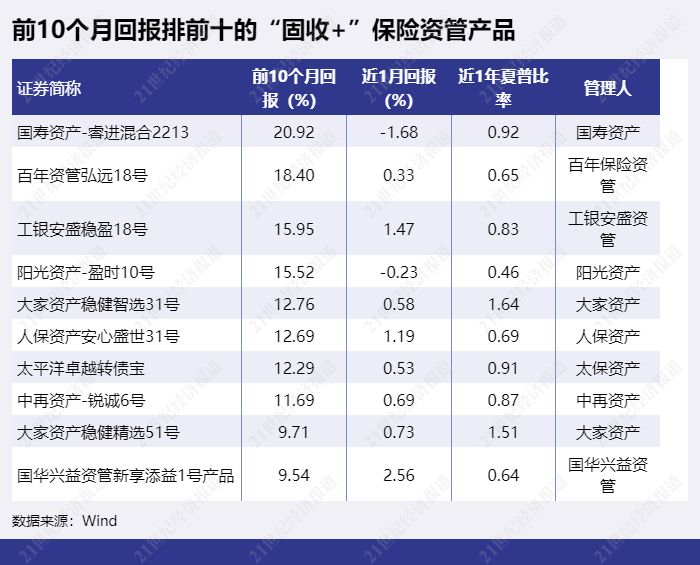 前10个月回报靠前的“固收+”保险资管产品,也有部分产品10月收益为负,比如前10个月回报排第一的“国寿资产-睿进混合2213”,10月回报为-1.68%。“阳光资产-盈时10号”10月回报为-0.23%,因此排名也略下滑。