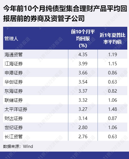 从券商及资管子公司的纯债型集合理财产品前10个月平均回报来看,海通资管、江海证券、申港证券依然整体表现居前。