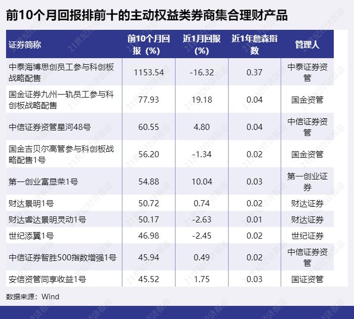此类产品前10个月平均回报排名靠后的券商及资管子公司则包括万联资管、大同证券、华龙证券等。