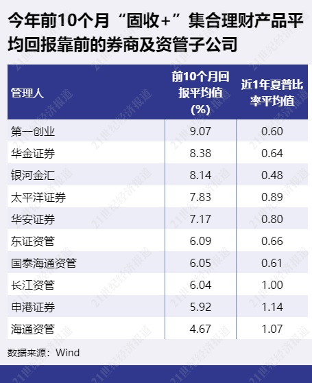 券商及资管子公司的“固收+”集合理财产品前10个月平均回报排名相比前三季度变动不大,第一创业依然排第一,前10个月平均回报为9.07%,华金证券以8.38%排第二,银河金汇以8.14%排第三。