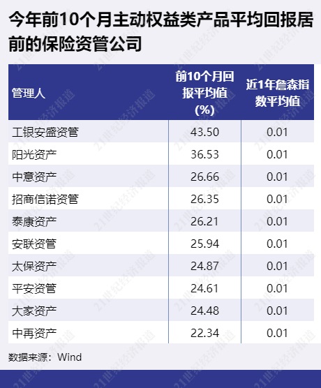 而前10个月主动权益类产品平均回报靠后的保险资管公司包括合众资产、民生通惠、华安资产等。