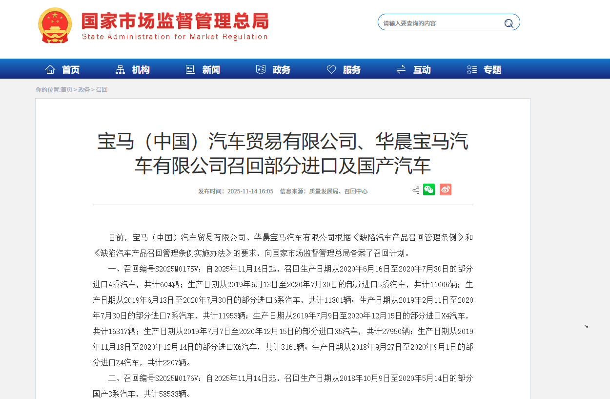 上证报中国证券网讯据市场监管总局11月14日消息,日前,宝马(中国)汽车贸易有限公司、华晨宝马汽车有限公司根据《缺陷汽车产品召回管理条例》和《缺陷汽车产品召回管理条例实施办法》的要求,向国家市场监督管理总局备案了召回计划。