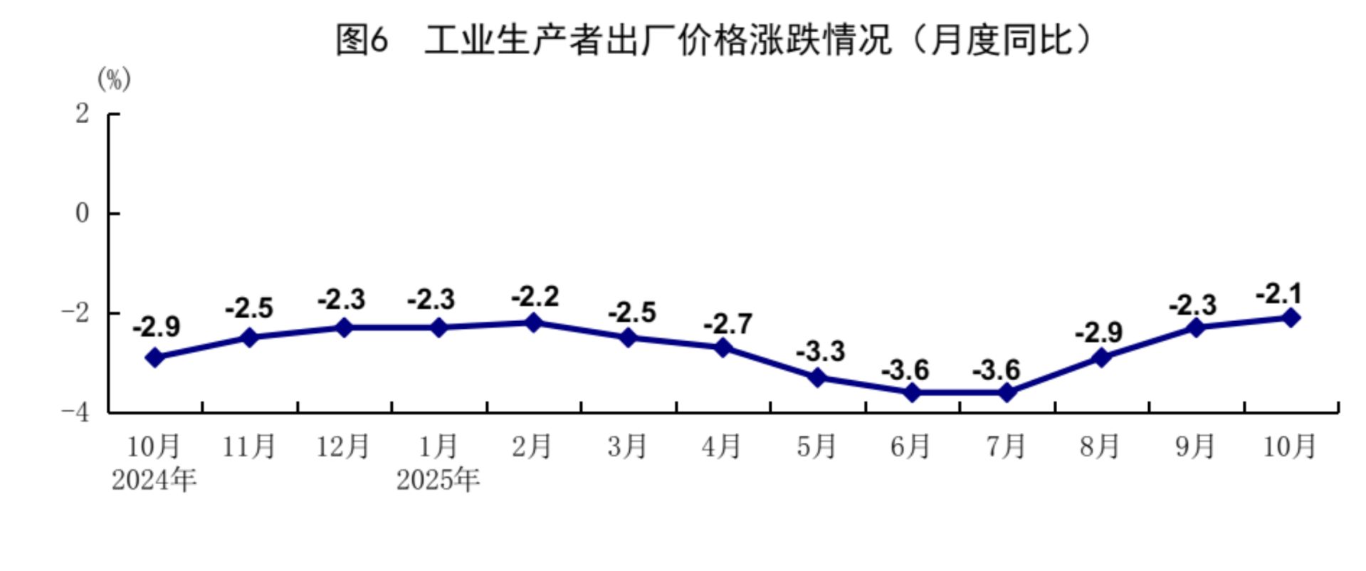 与此同时,物价出现积极变化。居民消费价格由降转涨,10月份居民消费价格同比上涨0.2%,上个月下降0.3%。其中扣除食品和能源的核心CPI同比上涨1.2%,涨幅比上月扩大0.2个百分点,连续六个月涨幅扩大。工业生产者出厂价格降幅连续收窄,10月份PPI同比下降2.1%,降幅比上月收窄0.2个百分点,连续三个月收窄。规范市场竞争秩序效果显现,10月份锂离子电池制造、光伏设备及元器件制造等行业价格环比分别上涨0.2%和0.6%。