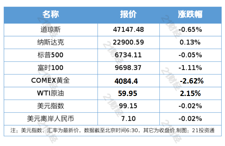 1、美国三大股指收盘涨跌不一,道指跌0.65%报47147.48点,标普500指数跌0.05%报6734.11点,纳指涨0.13%报22900.59点。联合健康集团跌超3%,耐克跌逾2%,领跌道指。万得美国科技七巨头指数涨0.35%,英伟达、微软涨超1%。中概股多数下跌,富途控股跌超7%,高途集团跌逾5%。