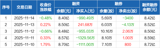 融资方面,当日融资买入1890.15万元,融资偿还2880.64万元,融资净偿还990.49万元。融券方面,融券卖出400股,融券偿还3800股,融券余量5.69万股,融券余额154.31万元。融资融券余额合计8.42亿元。