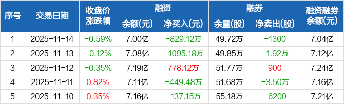 中铁工业:融资净偿还829.12万元,融资余额7亿元(11-14)
