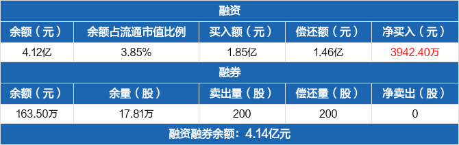 融资方面,当日融资买入1.85亿元,融资偿还1.46亿元,融资净买入3942.4万元。融券方面,融券卖出200股,融券偿还200股,融券余量17.81万股,融券余额163.5万元。融资融券余额合计4.14亿元。