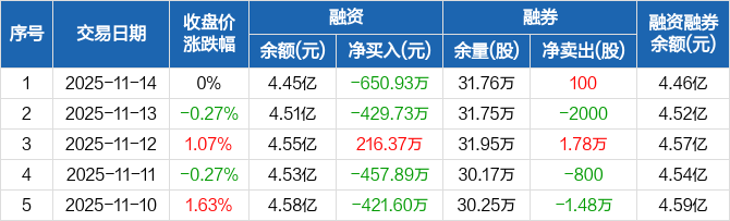际华集团融资融券信息显示,2025年11月14日融资净偿还650.93万元;融资余额4.45亿元,创近一年新低,较前一日下降1.44%。