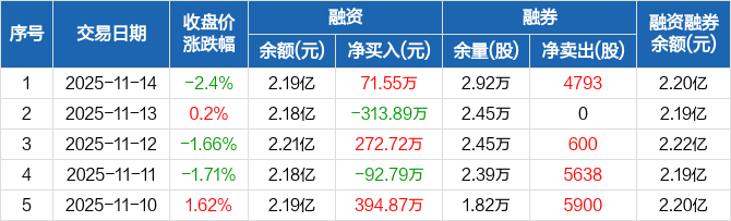 融资方面,当日融资买入1505.61万元,融资偿还1434.06万元,融资净买入71.55万元。融券方面,融券卖出5600股,融券偿还807股,融券余量2.92万股,融券余额98.57万元。融资融券余额合计2.2亿元。