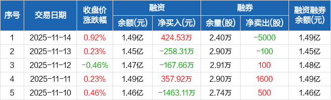 融资方面,当日融资买入3571.16万元,融资偿还3146.64万元,融资净买入424.53万元。融券方面,融券卖出100股,融券偿还5100股,融券余量2.4万股,融券余额10.54万元。融资融券余额合计1.49亿元。