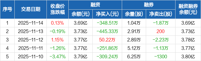 大恒科技融资融券信息显示,2025年11月14日融资净偿还348.51万元;融资余额3.69亿元,较前一日下降0.94%。