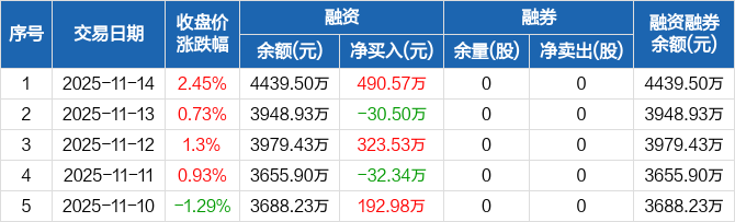 融资方面,当日融资买入814.16万元,融资偿还323.59万元,融资净买入490.57万元。融券方面,融券卖出0股,融券偿还0股,融券余量0股,融券余额0元。融资融券余额合计4439.5万元。