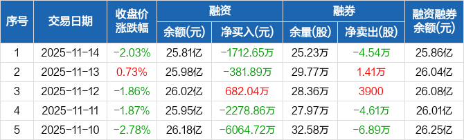 亨通光电融资融券信息显示,2025年11月14日融资净偿还1712.65万元;融资余额25.81亿元,较前一日下降0.66%。