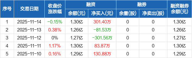 金达莱:融资净买入301.4万元,融资余额1.3亿元(11-14)