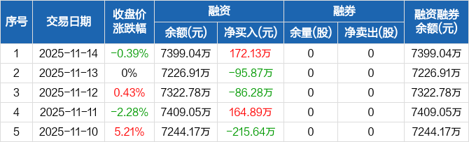 融资方面,当日融资买入572.42万元,融资偿还400.29万元,融资净买入172.13万元。融券方面,融券卖出0股,融券偿还0股,融券余量0股,融券余额0元。融资融券余额合计7399.04万元。