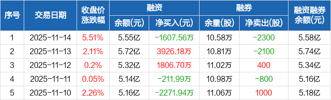 融资方面,当日融资买入1.71亿元,融资偿还1.87亿元,融资净偿还1607.56万元。融券方面,融券卖出3500股,融券偿还5800股,融券余量10.58万股,融券余额227.05万元。融资融券余额合计5.58亿元。
