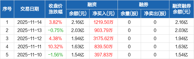 融资方面,当日融资买入5396.43万元,融资偿还4176.93万元,融资净买入1219.5万元,连续5日净买入累计6536.24万元。融券方面,融券卖出0股,融券偿还0股,融券余量0股,融券余额0元。融资融券余额合计2.16亿元。