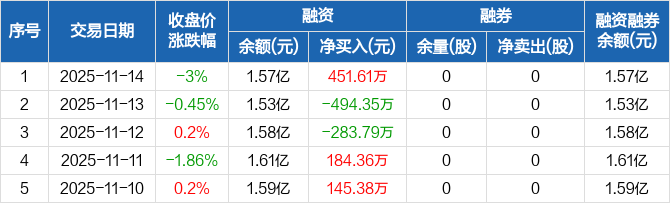 融资方面,当日融资买入1507.64万元,融资偿还1056.03万元,融资净买入451.61万元。融券方面,融券卖出0股,融券偿还0股,融券余量0股,融券余额0元。融资融券余额合计1.57亿元。
