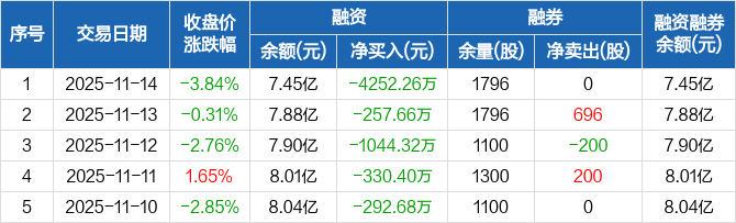 融资方面,当日融资买入2682.82万元,融资偿还6935.08万元,融资净偿还4252.26万元,连续7日净偿还累计8884.93万元。融券方面,融券卖出0股,融券偿还0股,融券余量1796股,融券余额22.65万元。融资融券余额合计7.45亿元。