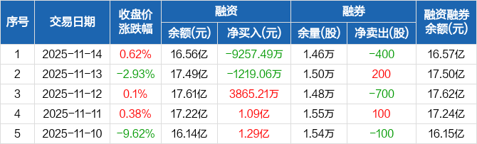 融资方面,当日融资买入1.62亿元,融资偿还2.55亿元,融资净偿还9257.49万元。融券方面,融券卖出0股,融券偿还400股,融券余量1.46万股,融券余额129.34万元。融资融券余额合计16.57亿元。