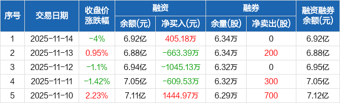 博敏电子融资融券信息显示,2025年11月14日融资净买入405.18万元;融资余额6.92亿元,较前一日增加0.59%