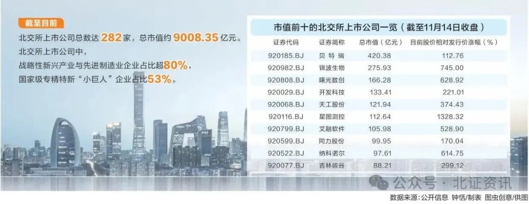 经过四年发展,北交所市场规模显著增长,截至11月14日,北交所上市公司总数达282家,总市值约9008.35亿元,迈向万亿元大关。根据证监会数据,北交所现有上市公司中,战略性新兴产业与先进制造业企业占比超80%,国家级专精特新“小巨人”企业占比达53%,创新主体集聚效应明显。