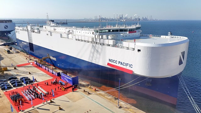 当日,由中集来福士为挪威建造的7000车位LNG双燃料汽车运输船“NOCC PACIFIC”号在山东省龙口市完工并举行命名仪式。该船针对新能源汽车运输安全做出了专门设计,可满足将于2026年1月1日起强制实施的《国际海运危险货物规则》第42-24修正案要求。