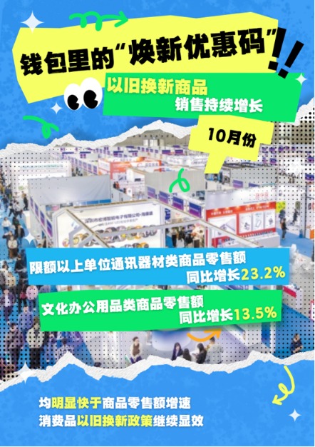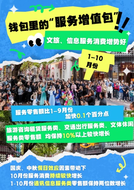 今年以来,各地区、各部门深入推进提振消费专项行动,加力扩围实施消费品以旧换新,大力发展数字消费和服务消费,扩大文体消费,推动消费潜力释放。11月14日,国新办举行新闻发布会,介绍2025年10月国民经济运行情况。一组海报,数览10月我国消费市场亮点,探寻钱包多样“打开方式”。