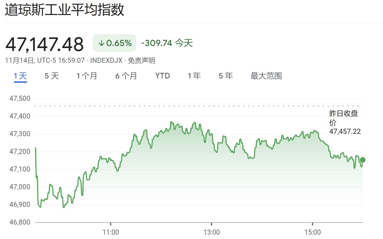 11月14日,美股上演“V型反转”。开盘后,道指一度跌超500点,纳斯达克一度跌近2%,一个多小时后,纳指直线拉升,盘中转涨,道指跌幅明显收窄。