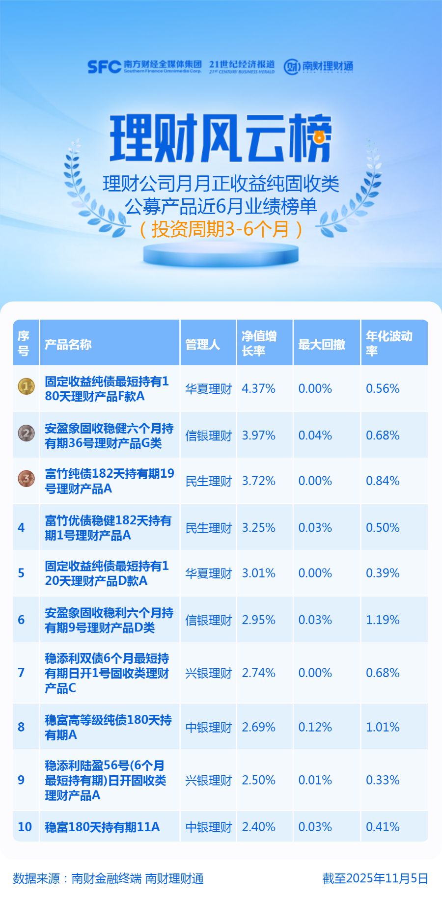 产品统计范围为理财公司3-6个月(含)期限的纯固收公募理财,且近6月每个完整的自然月月末均为正收益。产品统计截止日期为2025年11月5日,统计区间为近6月。