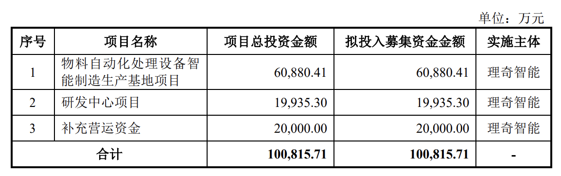 本次理奇智能拟募资约10亿元,扣除发行费用后约6亿元投入物料自动化处理设备智能制造生产基地项目,约2亿元投入研发中心项目,2亿元用于补充营运资金。