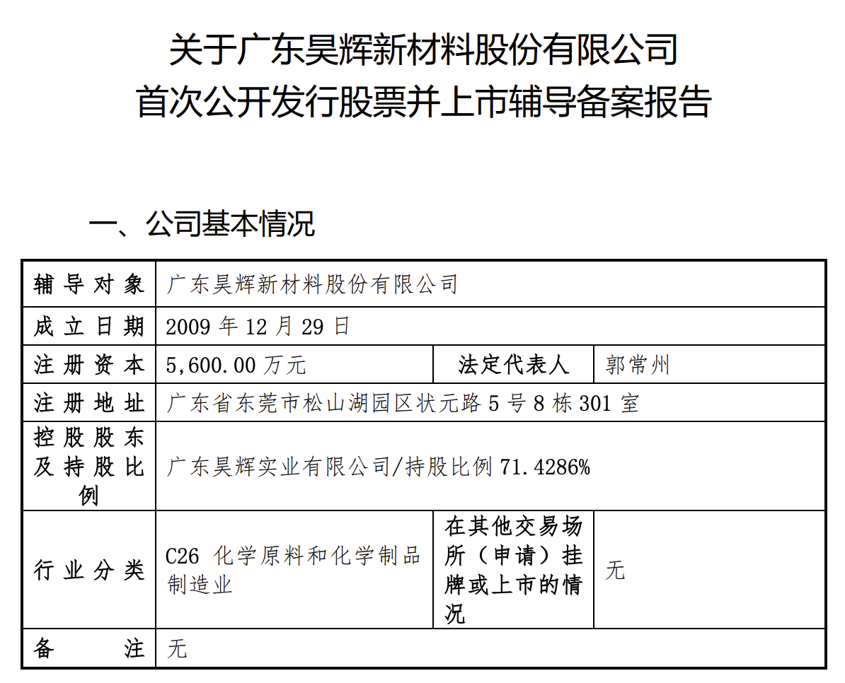 11月15日,证监会官网显示,广东昊辉新材料股份有限公司已启动上市辅导,东莞证券担任辅导机构。