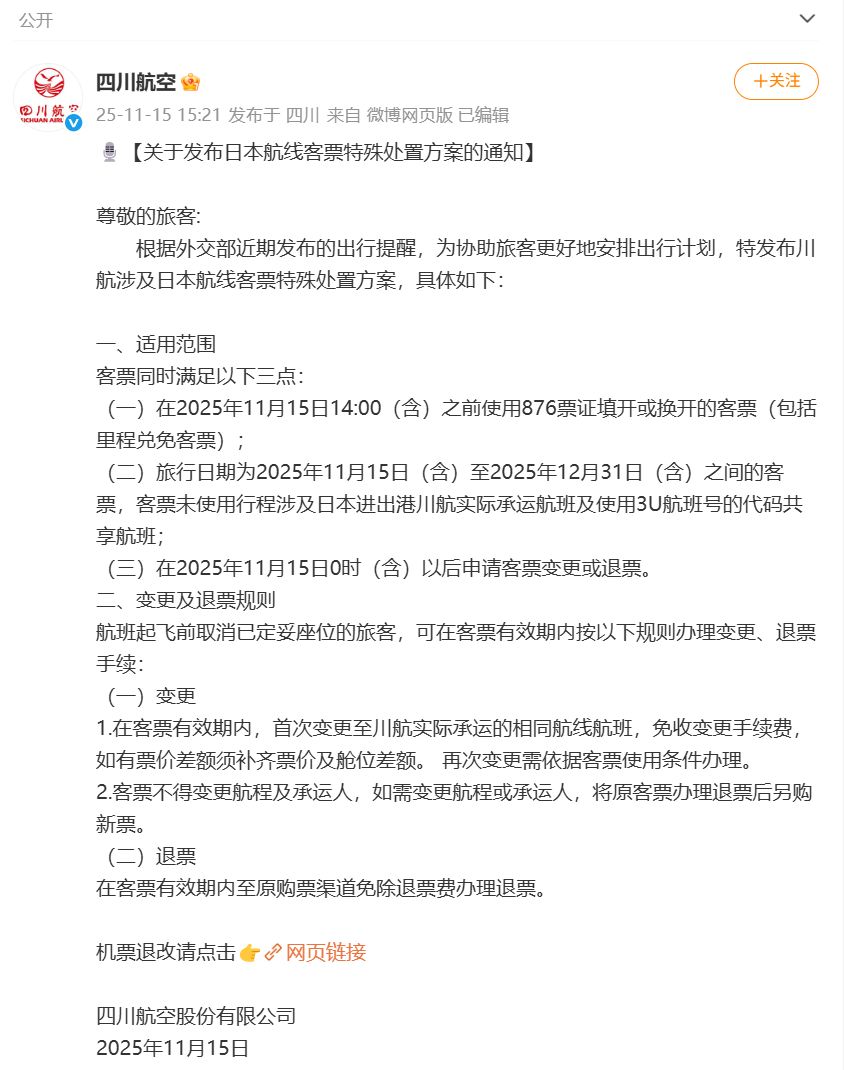 国航、南航、东航、川航等多家航司发布通知:日本机票免费退改签!外交部郑重提醒:近期避免前往日本
