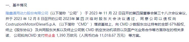 隆鑫通用还在2017年以4111万欧元(约合人民币3.04亿元)收购意大利CMD公司67%的股权。然而,在意大利CMD公司未实现航空发动机产品销售、航空发动机技术国产化计划未达预期的情况下,隆鑫通用在2023年12月拟以100万欧元(约合人民币793万元)价格转让意大利CMD公司67%股权,同时支付1390万欧元(约合人民币1.10亿元)的终止金,目前上述交易仍在推进中。
