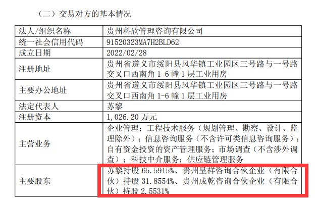 贵州科欣股东包括苏黎、贵州呈祥咨询合伙企业(有限合伙)(以下简称贵州呈祥)、贵州成乾咨询合伙企业(有限合伙)(以下简称贵州成乾)。