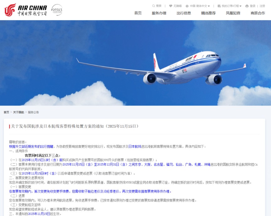 中国国际航空在通知中明确,对于在今年11月15日12时(含)前购买或换开产生新票号的国航999开头的客票(包括里程奖励客票);客票未使用行程涉及旅行日期为2025年11月15日(含)至2025年12月31日(含)之间东京、大阪、名古屋、福冈、仙台、广岛、札幌、冲绳进出港的国航实际承运航班和挂CA航班号的代码共享航班;在2025年11月15日0时(含)以后申请客票变更或退票(以取消客票订座时间为准)。在客票有效期内,首次变更免收变更手续费,但需收取子舱位差价及淡旺季差价,再次变更需依据客票使用条件办理。在客票有效期内,可以办理未使用航段退票,免收退票手续费。