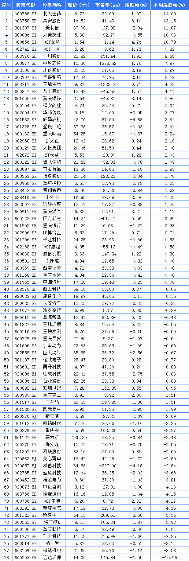 同花顺iFinD数据显示,78家重庆A股,其中收涨35家,平收4家,收跌39家。