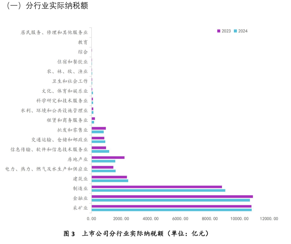 《报告》数据显示,2024 年,上市公司实际纳税额的平均值为 7.8亿元,中位数为 0.53 亿元。