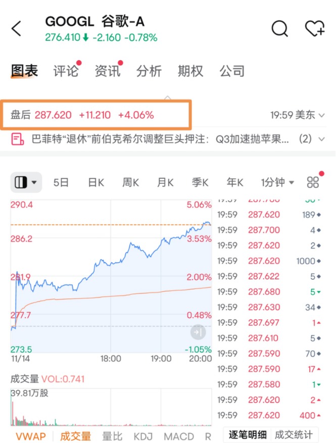 值得关注的是,伯克希尔在第三季度大举建仓谷歌母公司Alphabet,使得后者成为其第十大美股持仓。上述消息披露后,Alphabet在美股盘后大涨超4%。