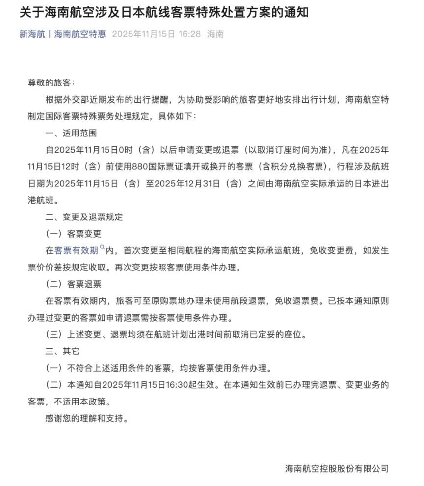 海航通知中明确,适用范围自2025年11月15日0时(含)以后申请变更或退票(以取消订座时间为准),凡在2025年11月15日12时(含)前使用880国际票证填开或换开的客票(含积分兑换客票),行程涉及航班日期为2025年11月15日(含)至2025年12月31日(含)之间由海南航空实际承运的日本进出港航班。