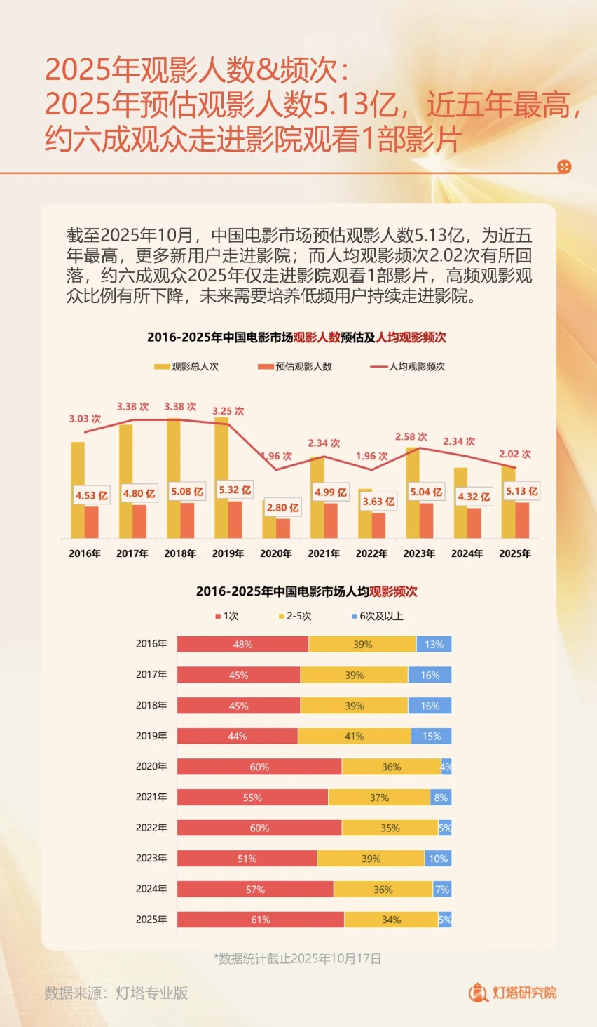对此,灯塔研究院院长牧晨表示,2025年中国电影市场实现稳中有进的增长态势,观影人数再创近年新高,与此同时,人均观影频次的回落却如一面镜子,映照出观众观影决策的愈加审慎。