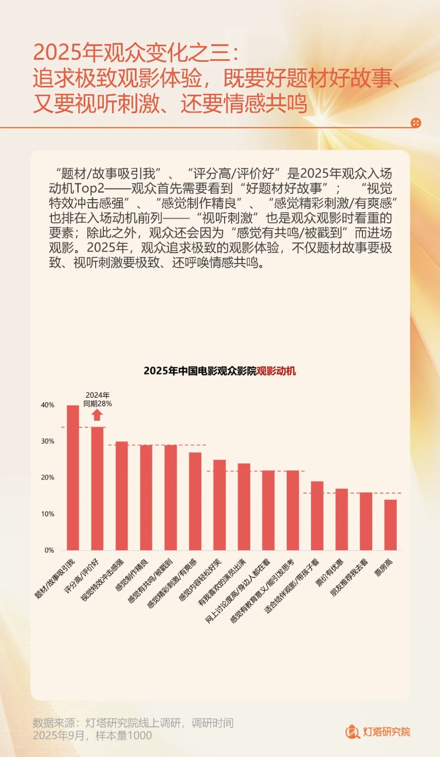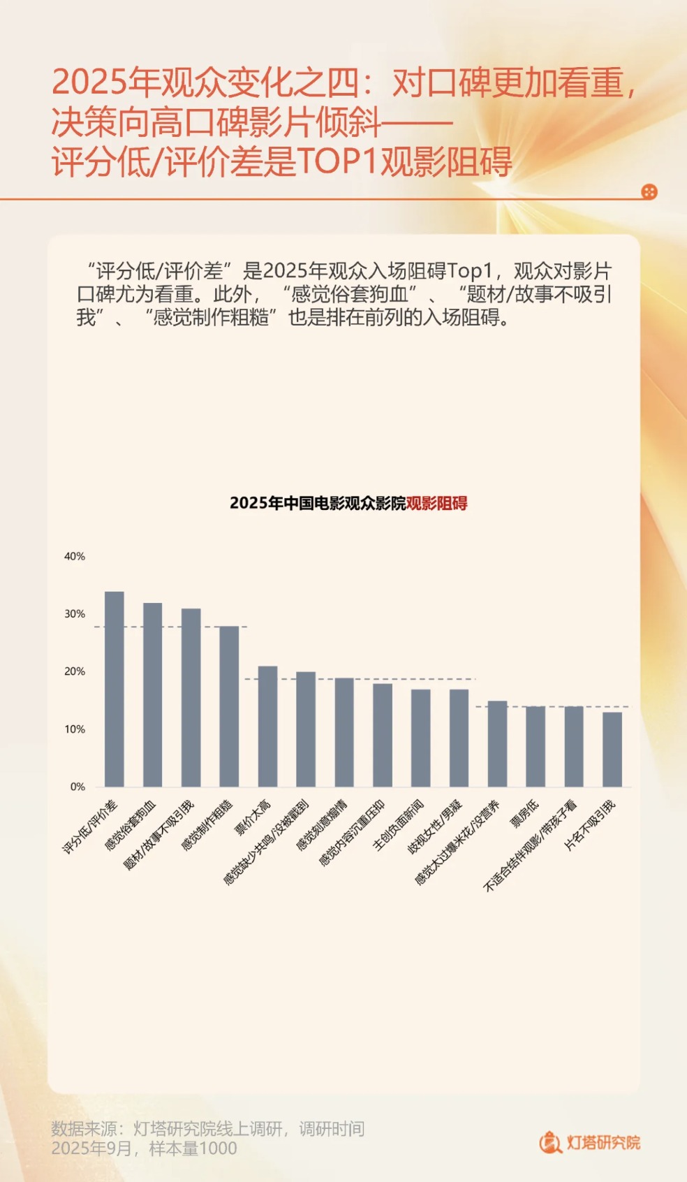 据灯塔研究院调查统计,观众在今年的观影动机中,“题材/故事吸引我”“评分高与评价好”是最主要的动机;而在阻碍观影的因素统计中,“评分低与评价差”是最多被提及的。