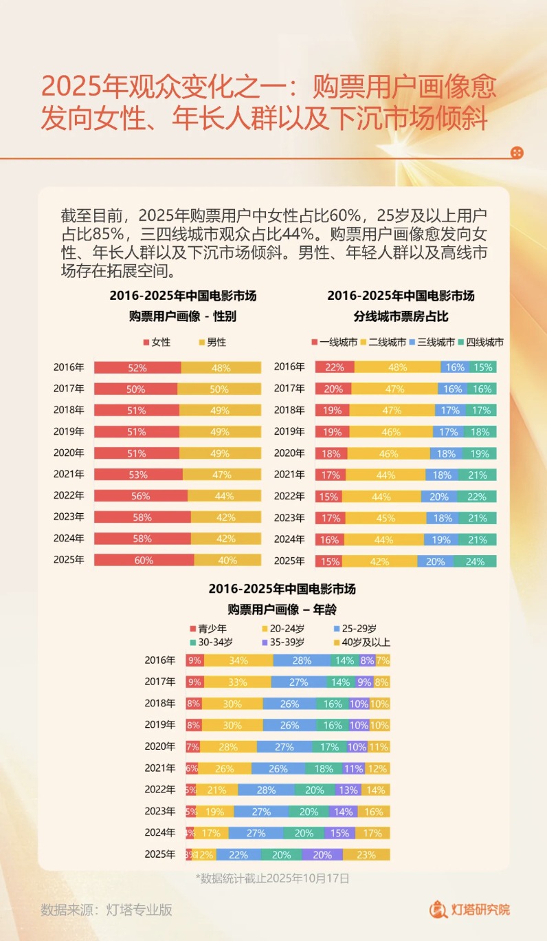《报告》显示,从2016年至2025年,购票用户画像中,女性占比一路增长,到2025年已增至60%,为近10年最高;按照分线城市占比来看,一线和二线城市的票房占比分别从2016年的22%和48%,一路下降至今年的15%和42%;从年龄的角度看,24岁及以下观众的比例从2016年的43%持续下滑至今年的15%。