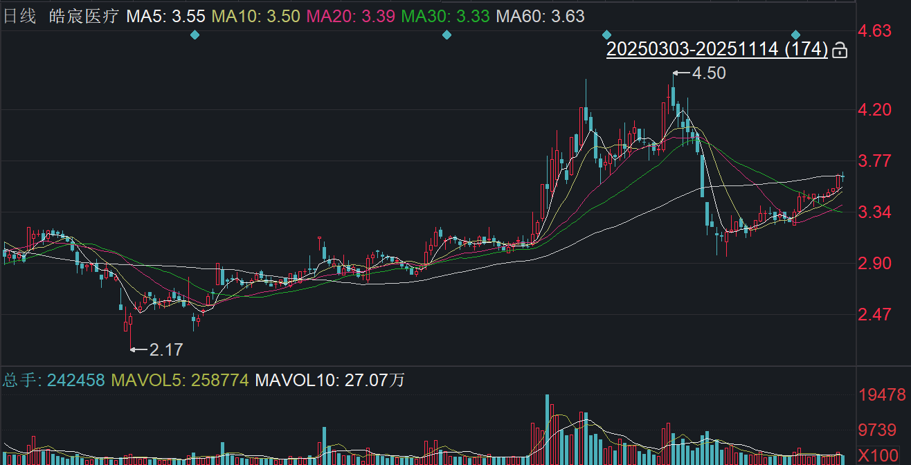 二级市场上,截至11月14日收盘,皓宸医疗下跌0.55%报3.62元/股,总市值约30.41亿元,今年来公司股价累计上涨超三成。