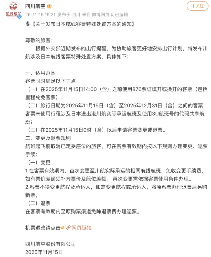 15日,国航、南航、东航、海航、川航、厦航等航司相继发布通知,对于出行日期在12月31日之前,涉及日本相关航线且符合相关条件的客票,可予以免费退改处理。