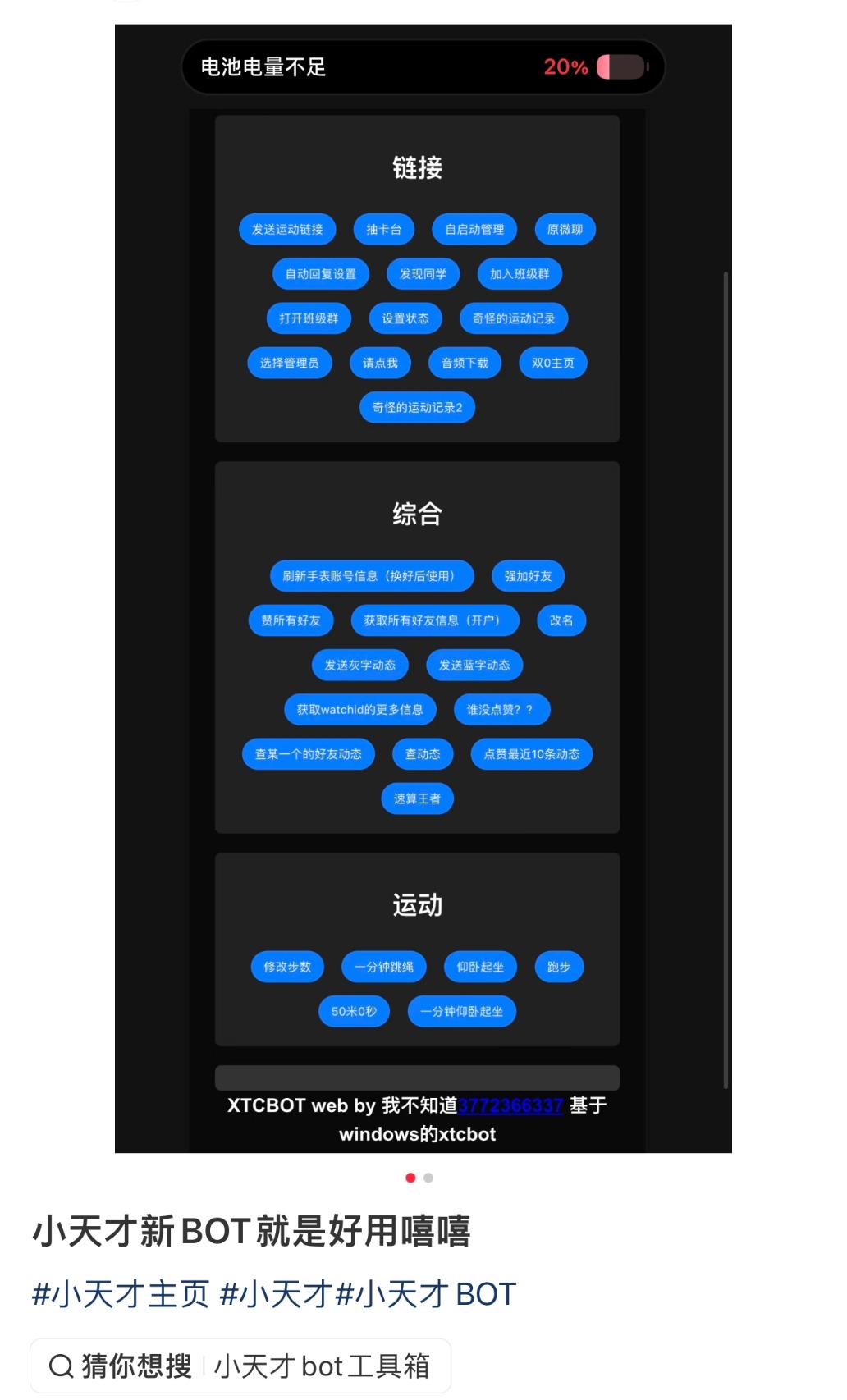据了解,集赞还衍生出找第三方刷赞工具:小天才“bot”。在小天才圈子内,“bot”是指集成了刷赞、修改记录、发送花字动态等功能的网页,需要支付几十到上百元,以使用相关服务。