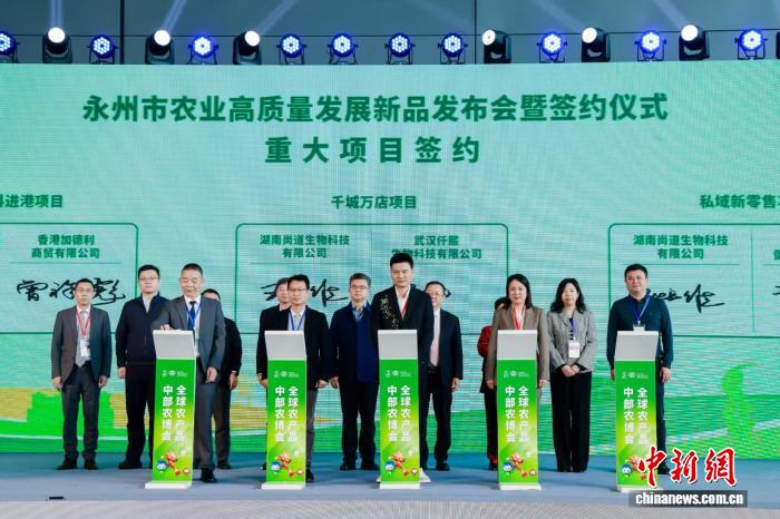 中新网长沙11月15日电 (唐小晴胡颖莹纪晗)11月14日至17日,第二十六届中国中部(湖南)农业博览会在长沙国际会展中心举办。其间,湖南永州市举行了农业高质量发展新品发布会暨签约仪式。