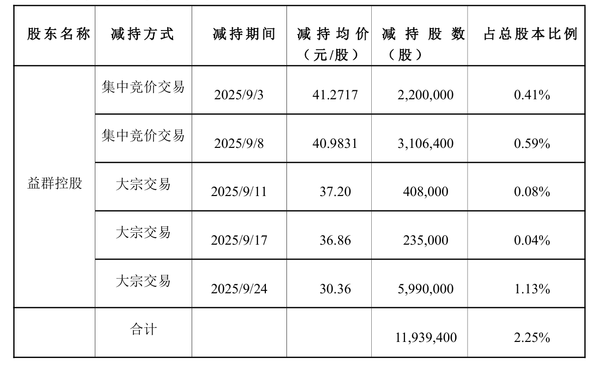 据9月25日公告,益群控股于9月3日至9月24日通过集中竞价交易方式和大宗交易方式合计减持公司股份1193.94万股,占公司总股本比例2.25%。