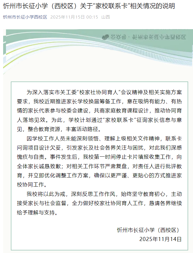 山西忻州市长征小学(西校区)11月14日发布情况通报称,我校近期推进家长学校换届筹备工作,计划通过“家校联系卡”征询家长信息与意见,因学校工作人员未能深刻领悟、理解上级相关文件精神,联系卡问询项目设计欠妥,引发家长及社会各界关注与困扰,对此我们深感愧疚与自责。事件发生后,我校第一时间停止卡片填报收集工作,向全体家长诚恳致歉;对相关工作环节严肃复盘,对责任人进行批评教育,并立即优化调整工作方案,确保以更严谨、更贴心的方式推进家校协同工作。